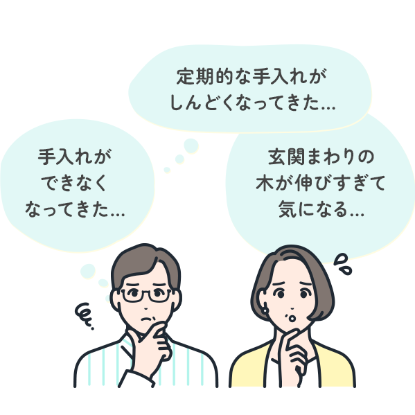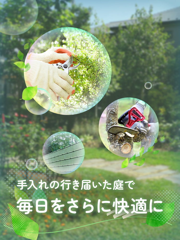 伸びすぎた枝の剪定や草刈り、玄関まわりの植栽整理など、「自分ではなかなか手が回らない」というお庭のお手入れをプロの技でサポートいたします。